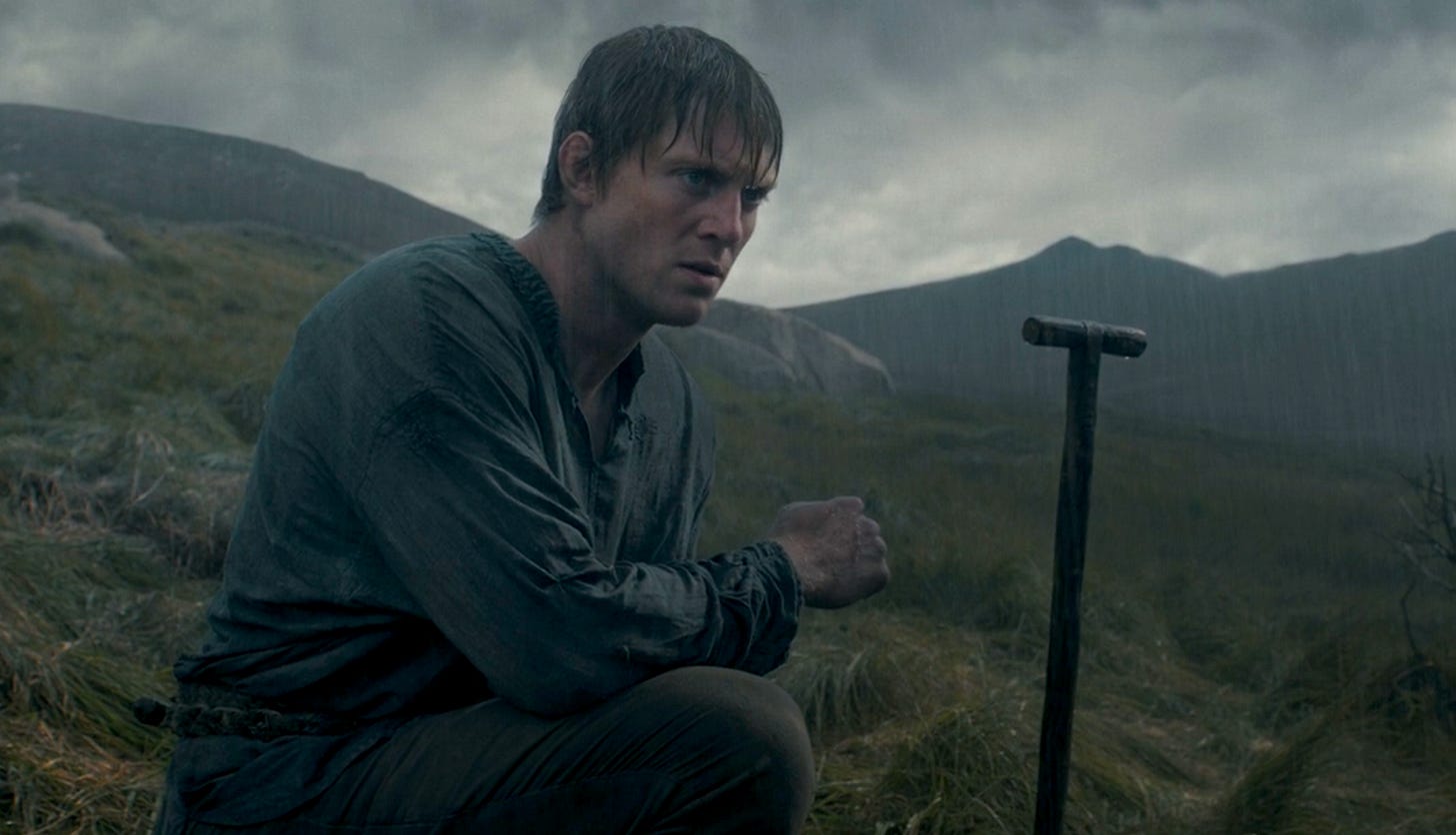 In Martin’s story, the first time Dunk speaks out loud is when he apologetically tells his dead father-figure that he’s going to take Ser Arlan’s longsword for himself. The scene unfolds in the book like this: