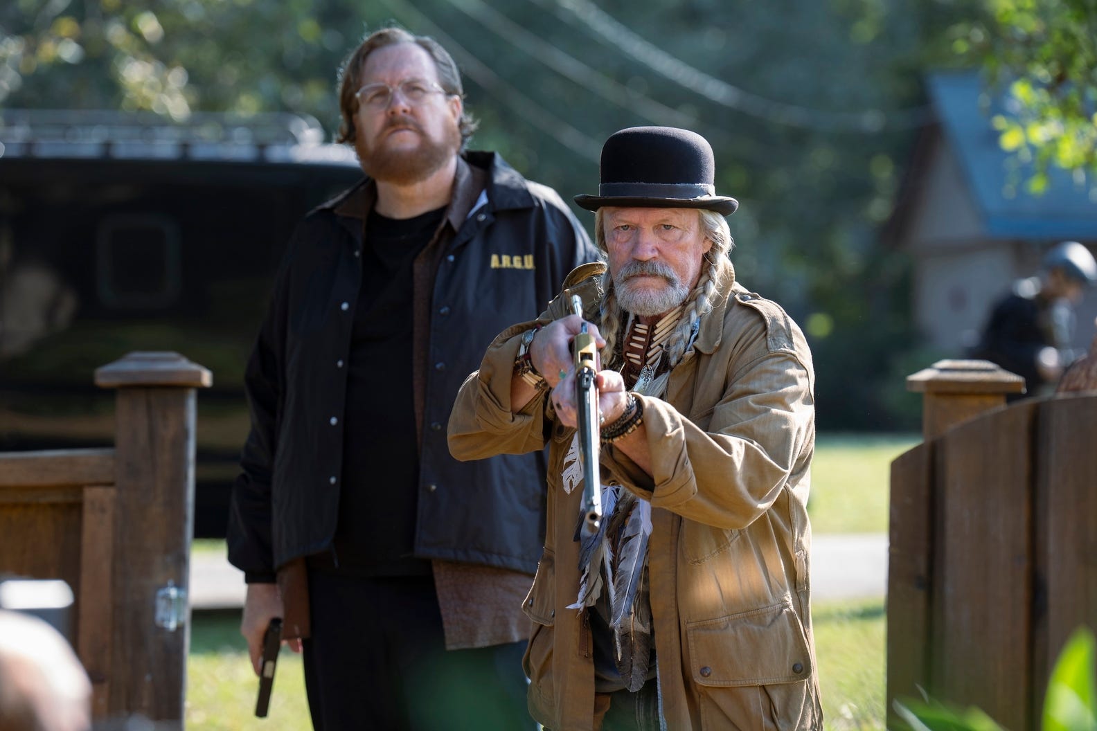 Soon, Adrian arrives with the door frames, and Chris texts Harcourt about meeting up one last time because “I need her to answer a question before I know what to do next.” Meanwhile, Harcourt reluctantly decides to accept Flag Sr.'s offer and tells him and the A.R.G.U.S. team exactly where she’s meeting Chris. As if Chris didn’t have enough trouble, we join Red St. Cloud deep in the woods, culturally appropriating his version of an indigenous dance and using his “third eye” blood to draw an eagle in the sand around his campfire. Then, surprisingly, Red seems to enter a spiritual realm, as blue flames erupt around him and a blood eagle appears on his forehead. Shortly after, he’s floating through the sky, seeing visions of Eagly, which leads him directly to Chris’s cabin in Settlers’ Hills.